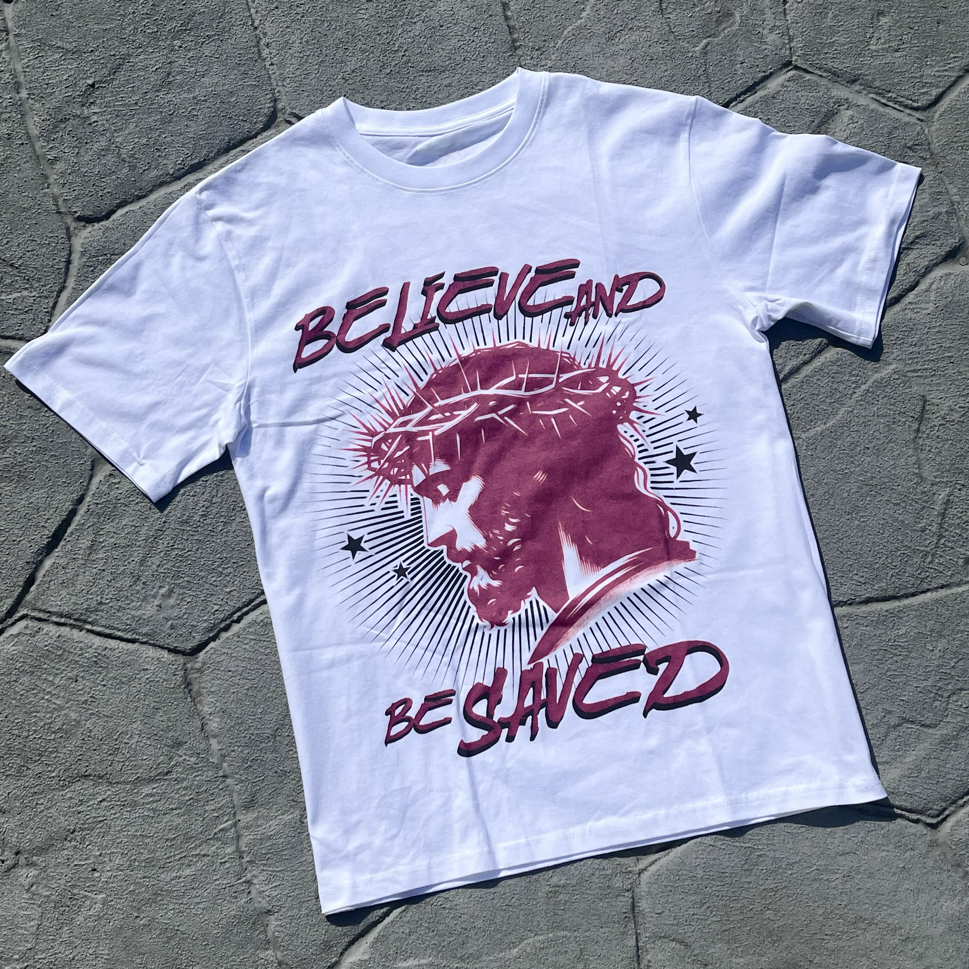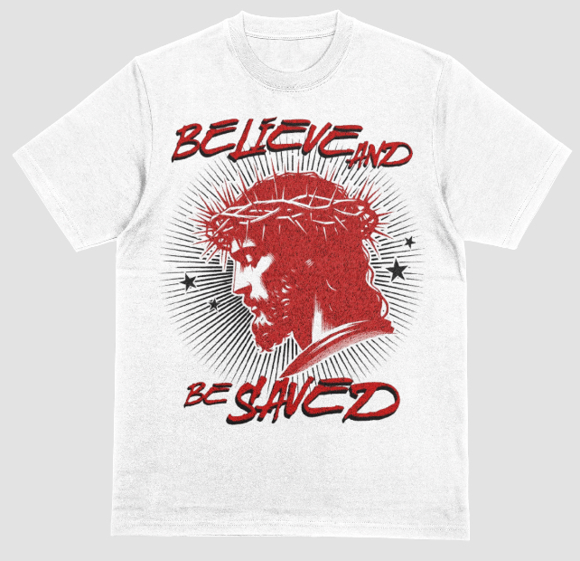 Make a bold statement of faith with this striking "Believe and Be Saved" t-shirt, featuring a powerful red illustration of Jesus crowned with thorns. The dynamic design and radiant background draw the eye and inspire reflection wherever you go. Perfect for church events, outreach, or everyday wear to proudly share your belief.